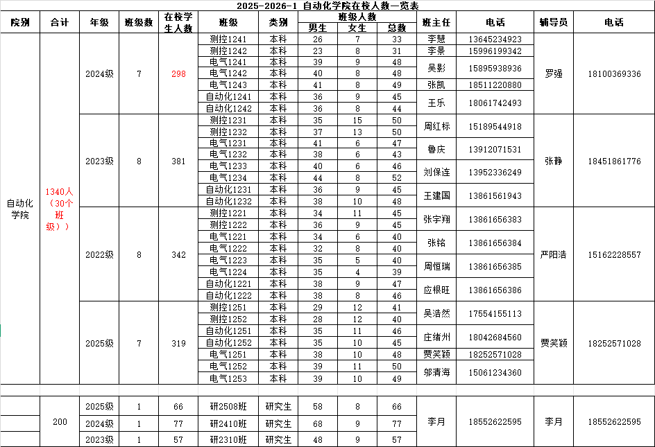 2025-2026-1 自动化学院在校人数班主任安排