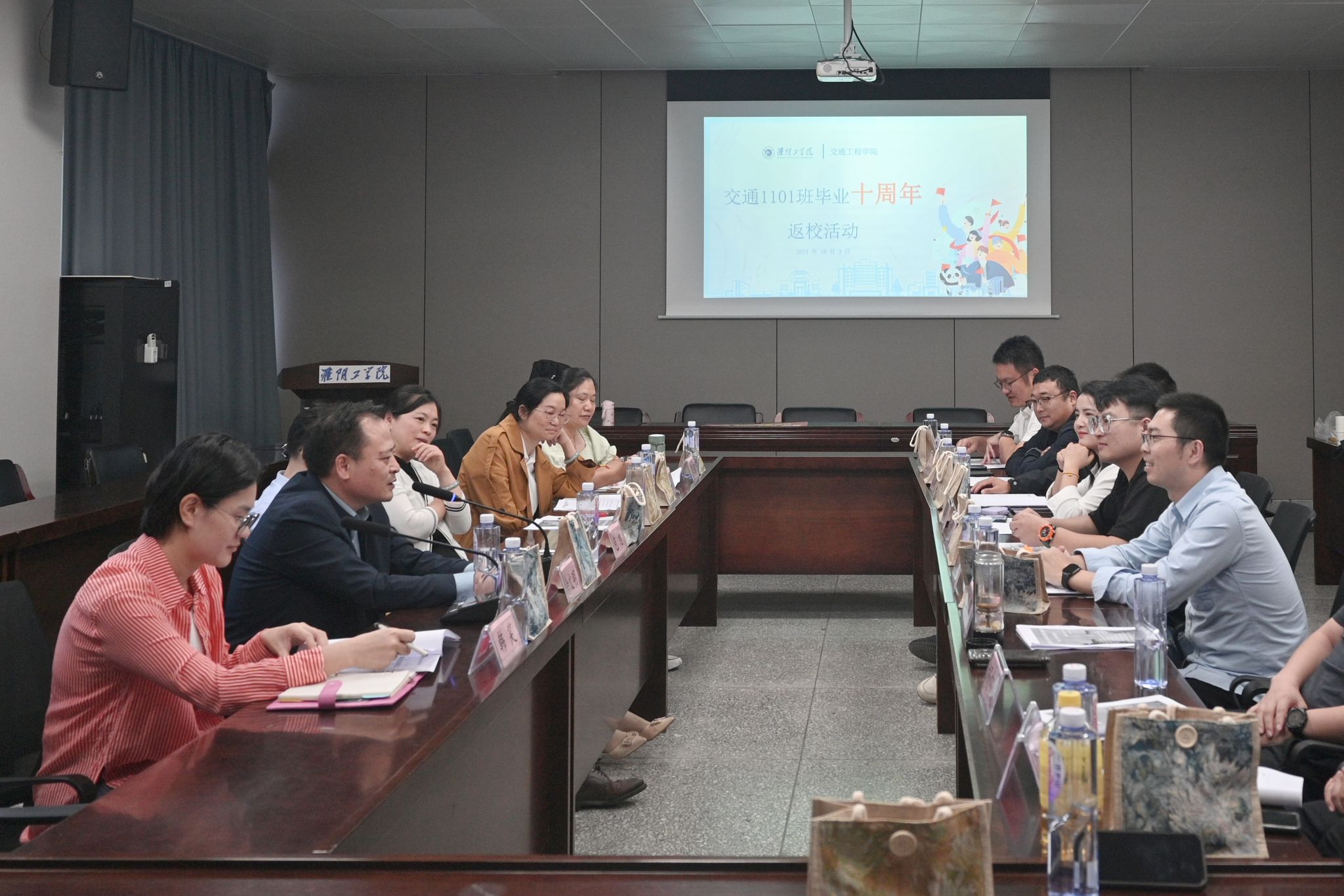 2024年10月3日下午两点,交通工程学院交通1101班于24217开展了毕业十周年返校活动。人事处处长包旭,学院党委书记桑海云,继续教育学院院长余文明,学院退休及在职教师代表等出席了本次活动。
