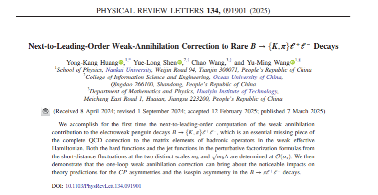 近期,数理学院教师王超联合南开大学教授王玉明、中国海洋大学教授沈月龙,在国际物理学期刊《Physical Review Letters》发表研究论文《Next-to-Leading-Order Weak Annihilation Correction to Rare B→{K, π}ℓ+ℓ-Decays》。此次为王超2023年以来第3次在该期刊发表论文。